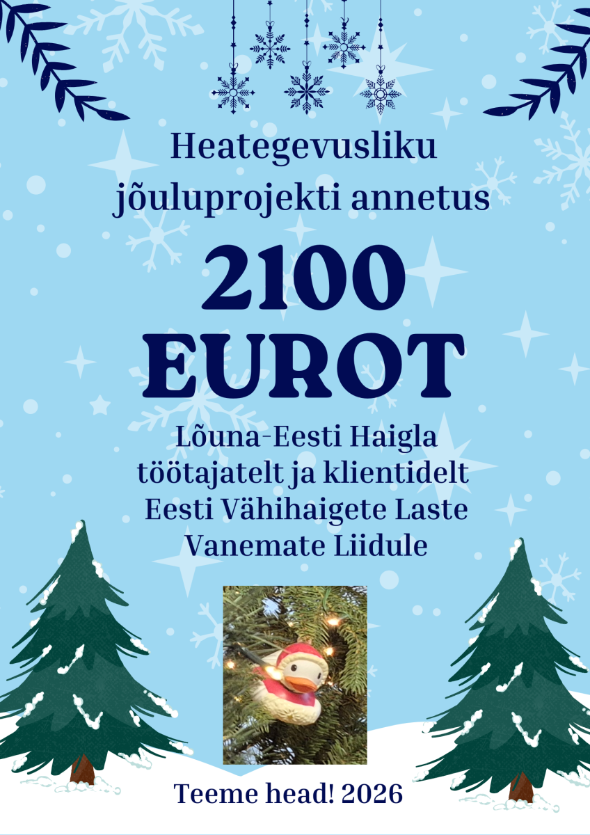 Kolmekuningapäeval andsime üle heategevusliku jõulupardipuu projekti raames korjatud annetuse summas 2100 eurot Eesti Vähihaigete Laste Vanemate Liidule.